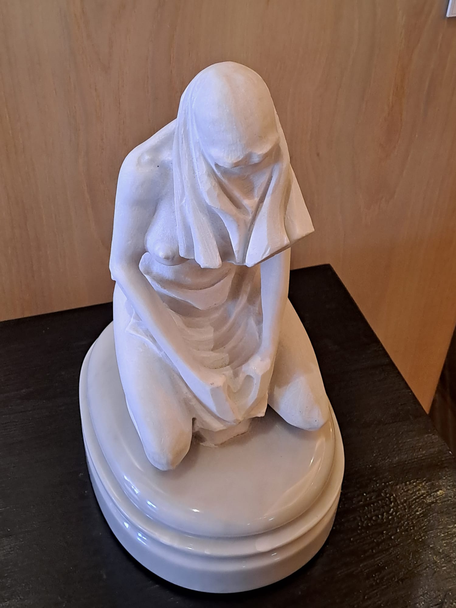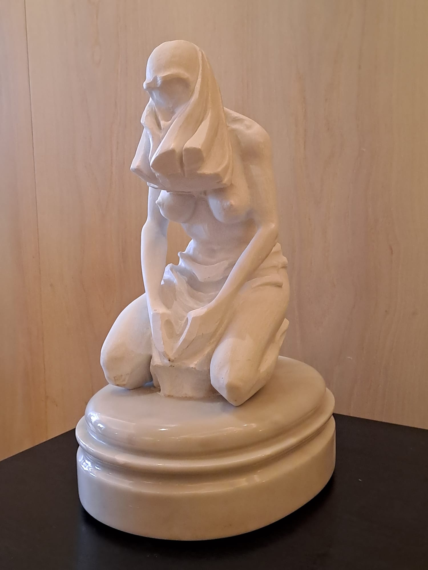 Partially veiled, the female figure leans inward, vulnerable yet dignified. Her posture evokes a sense of loss, silent endurance, or emotional surrender.