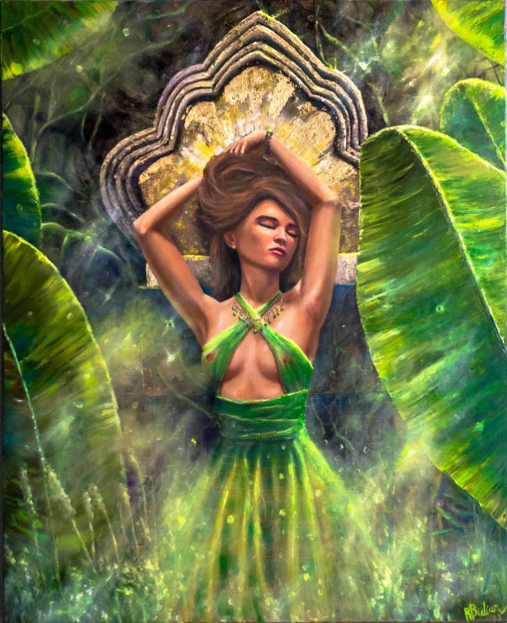 Woman in harmony with the golden jungle, wrapped in light, nature, and feminine power.