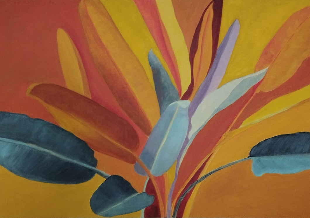 The painting bursts with vibrant colors, dominated by lush strelitzia leaves—long, pointed, dancing—intertwining like tropical flames. Warm tones prevail: blazing oranges, intense reds, golden yellows, and vibrant blues blend like a sunset in motion. Each leaf seems to capture the tropical sunlight, reflecting brilliance and warmth, as if the canvas itself pulses with life. The background is bathed in a golden glow, evoking an endless summer afternoon. There is joy in the air—a celebration of nature, color, and freedom.