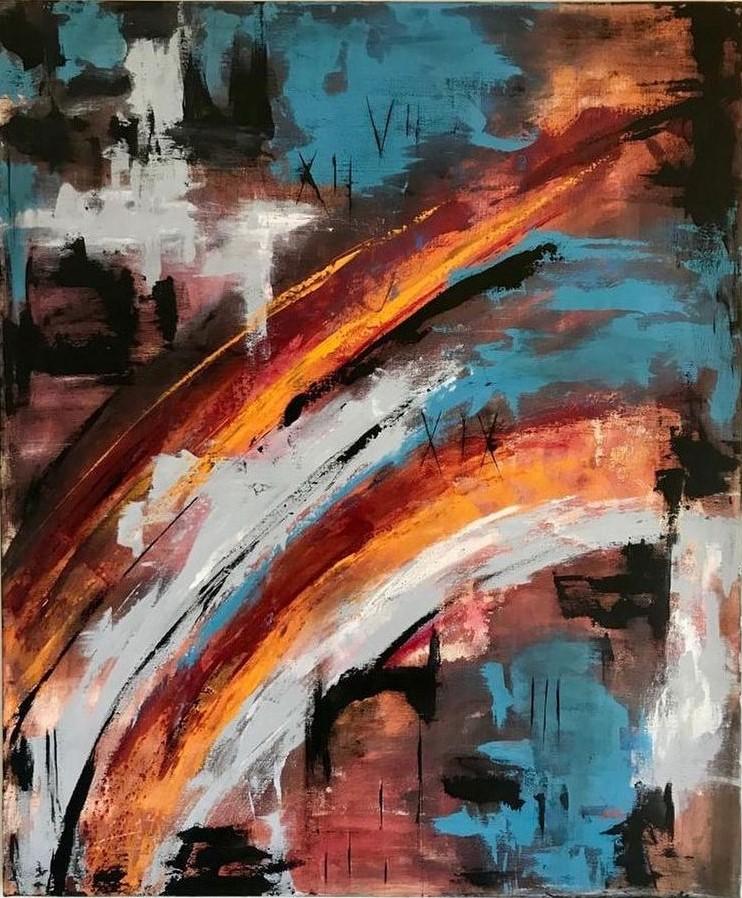 In this painting, I see the colours of my hometown. I played with the blue of the sky