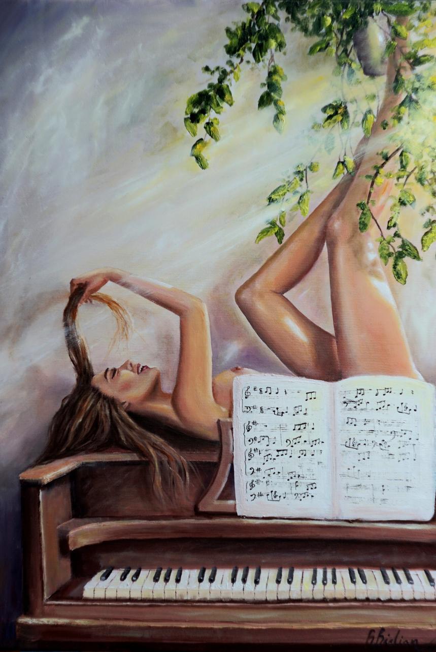 Woman and piano merge in a surreal image; pose suggests strength, freedom, and a bond between body, music, and nature.