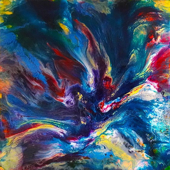 Blue dominates, unfolding in endless variations. Shapes dissolve and reinvent, like verses composing a silent melody.
