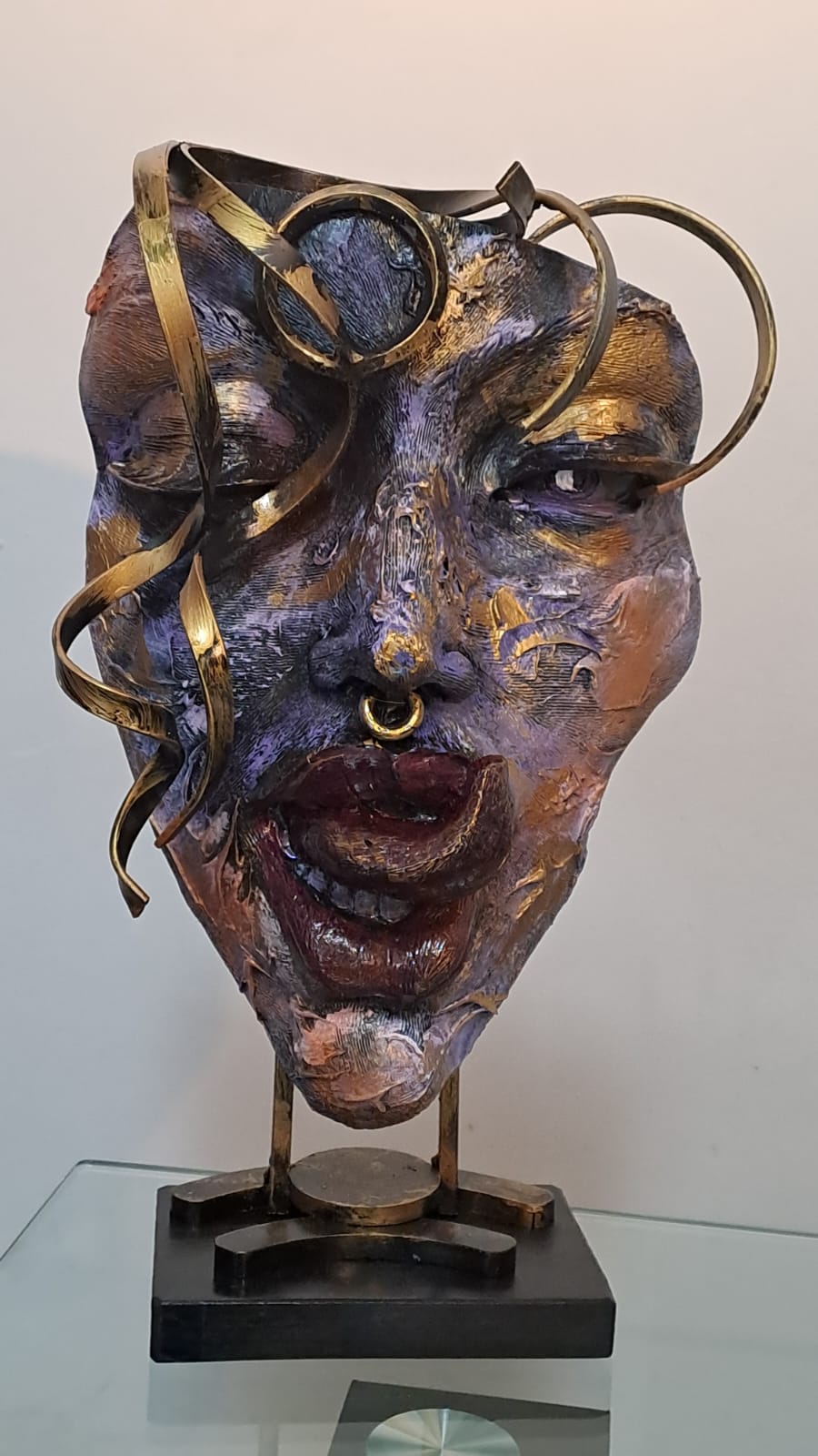 This sculpture is a visual song emerging from the depths of the self. With a slightly open mouth and an intense expression, it seems frozen in the moment before a scream, a sigh, or a revelation. Metallic curves wrap around the face like thoughts struggling to find order, while the painterly texture and violet tones highlight a restrained emotion. It is a portrait of the unspoken—of what dwells in silence and longs to be released.