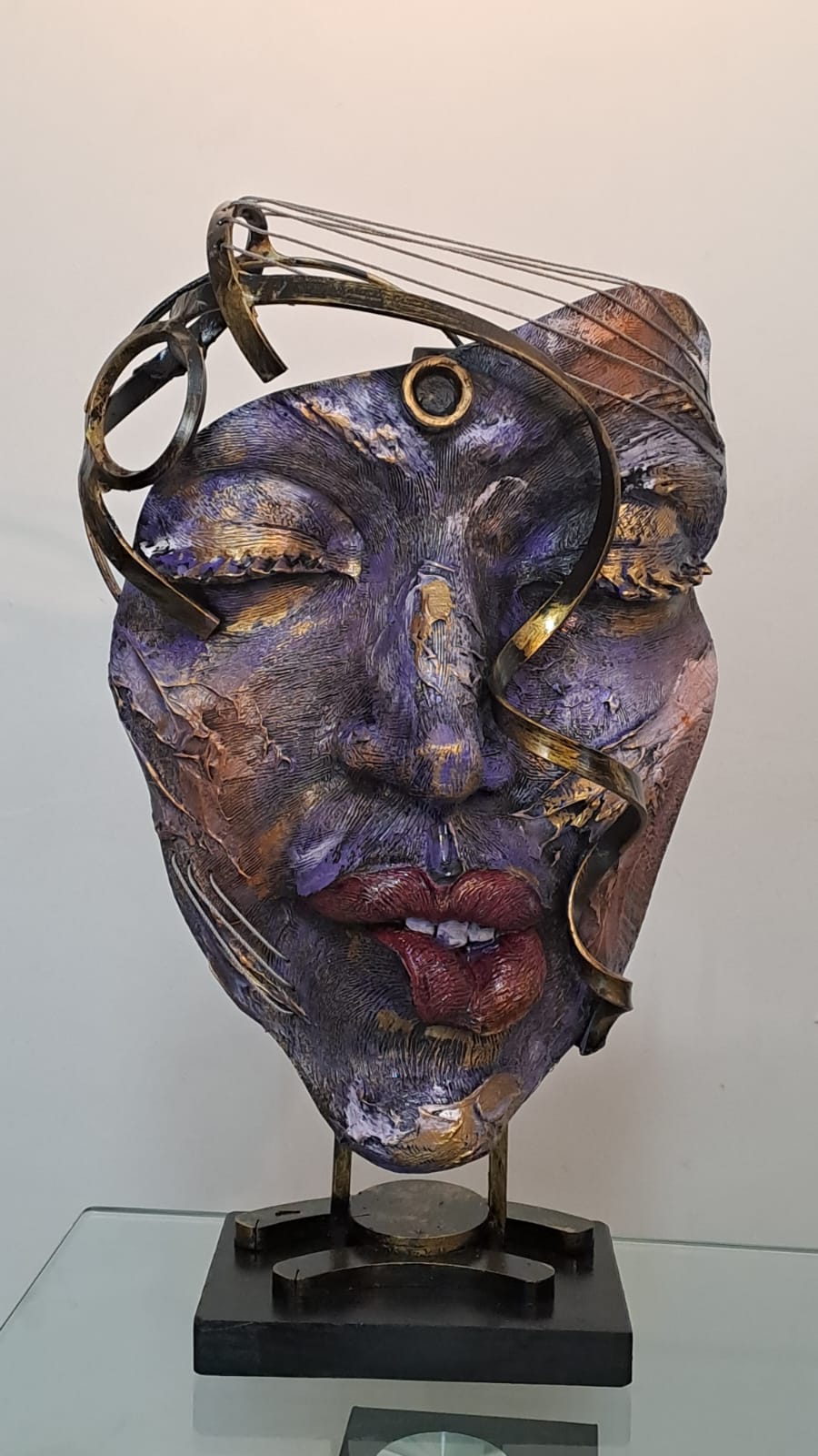 Hans Varela invites us to a state of deep introspection. With closed eyes and slightly parted lips, this face appears suspended in a moment of inner connection. The metallic cords crossing the upper section evoke musical notes or strained thoughts, as if each line vibrates with a different emotion. The color and texture breathe life into a figure that does not shout but resonates from the silence—a work that transforms stillness into a visual melody.